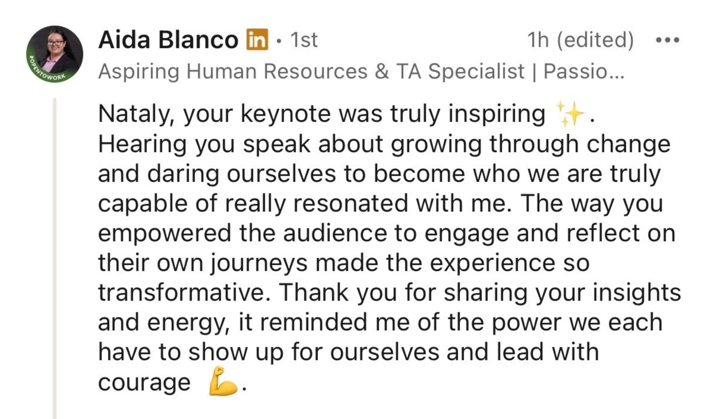 Every talk is customized. Nataly has never given the same talk twice. she invests real time before every engagement to understand your audience, your moment, and what will make the biggest difference.